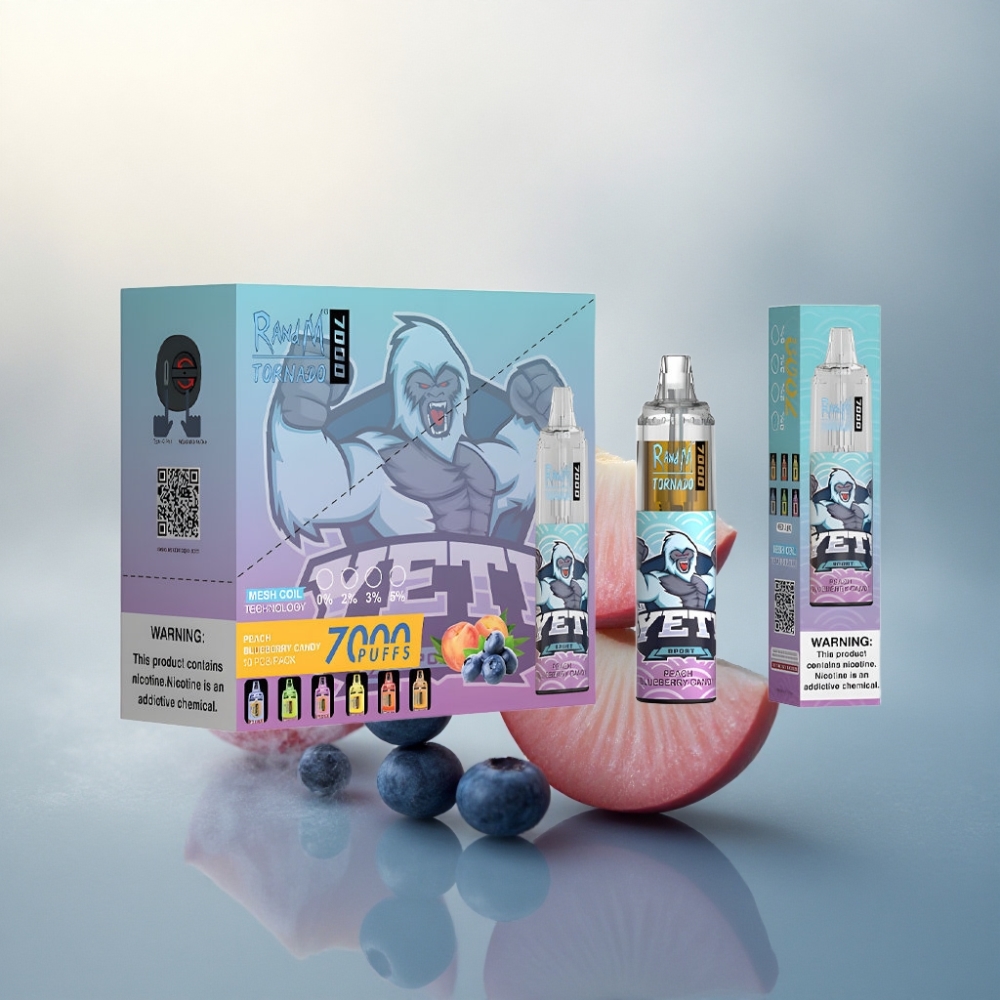 RandM Fumot Tornado 7000 Puffs حلوى الخوخ والتوت الأزرق مع 14 مل من السائل الإلكتروني وبطارية 850 مللي أمبير